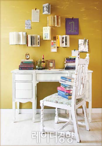 책장에 빼곡히 꽂혀 있는 책은 단지 읽고 보는 기능뿐 아니라 이색적인 아름다움을 자아내는 모티브를 위한 아이템이 될 수 있다. 빛바랜 책 몇 종류를 펼치거나 오리고 접어 콜라주 하듯 빈 벽에 자연스럽게 붙이면 입체감 있는 아트월이 완성된다. 책이 많지 않아도 서재에 있는 듯한 기분을 느낄 수 있을 것이다.
